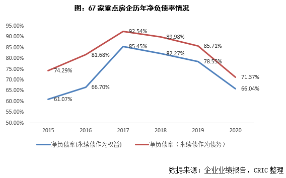 值得注意的是,永續債理論上雖然也能為企業增添權益,改善杠桿,但由于永續債“明股實債”的特性,三條紅線提出后監管層面嚴控房企永續債發行,2020年三條紅線公布之后企業新發行的永續債量約為84億元,占全年22%,2021年至今無企業發行永續債。基于此,2020年末67家重點房企的永續債存量1429億元,同比減少56億元。永續債作為債務計算的加權凈負債率為71.37%,同比減少14.3個百分點。