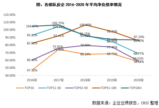 從各梯隊的企業表現來看,2020年末凈負債率最低的梯隊還是TOP10房企,為58.18%,實際上,50強房企凈負債率差距不大,且明顯低于排名第50名之后的房企。值得注意的是,所有梯隊的房企的加權凈負債率均實現了下降,其中TOP31-50的房企降幅最大,同比減少18.43個百分點至59.02%,TOP100+房企凈負債率僅下降0.36個百分點至87.24%。