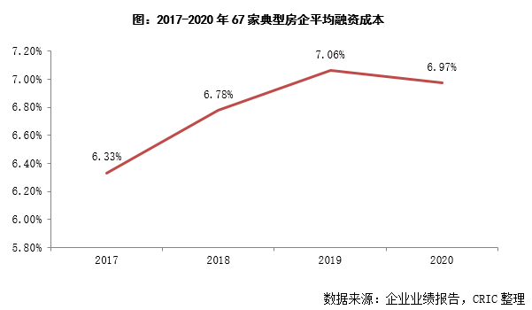 2020年67家重點房企的融資成本較2019年略微降低了0.09個百分點至6.97%,是2017年以來首次下降。出現這種情況的主要原因在于2020年的貨幣環境整體較為寬松,房企境內外融資成本均有所下降,同時2020年境外債發行量占比有所下降,由于境外債發行成本普遍高于境內債券,從而也導致了整體融資成本降低。
