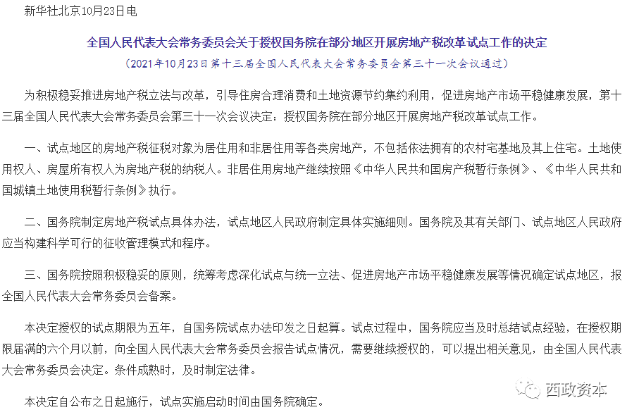 2021年10月23日,第十三屆全國人大常委會第三十一次會議作出決定,授權國務院在部分地區開展房地產稅改革試點工作。