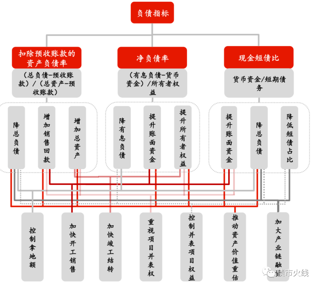 控制拿地額、加快開工銷售和加快竣工結轉三種手段主要從地產(chǎn)開發(fā)業(yè)務層面出發(fā),而重視項目并表權、控制并表項目權益、推動資產(chǎn)價值重估以及加大產(chǎn)業(yè)鏈融資則可以從地產(chǎn)金融(包括資產(chǎn)證券化)角度出發(fā)找到突破路徑。