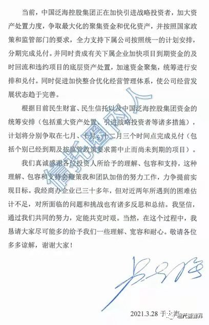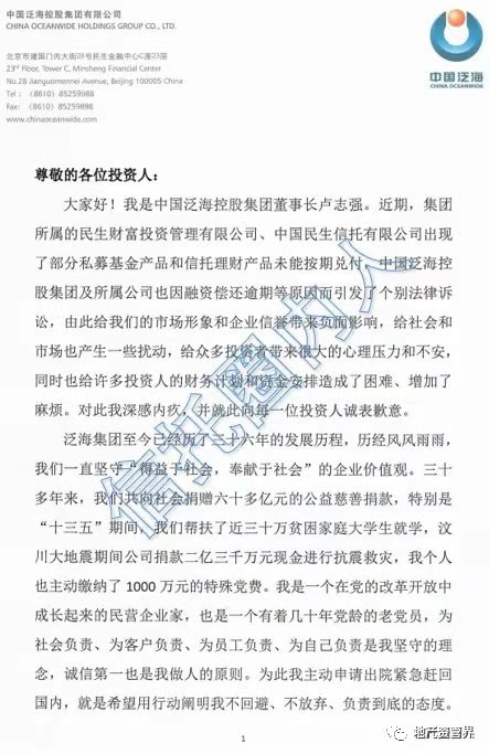 原標(biāo)題: 民生信托暴雷實錘!實控人盧志強(qiáng)致投資人函曝光