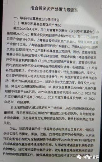 “截止到2020年4月末,民生財富尊系列基金存量規(guī)模265億元;尊基金投資項目資產(chǎn)余額223億元。其中,已延期項目資產(chǎn)余額196億元,占尊基金投資項目資產(chǎn)余額88%;預(yù)計延期項目資產(chǎn)余額18億元,占尊基金投資項目資產(chǎn)余額8%。巨額的延期項目資產(chǎn)及預(yù)計延期項目資產(chǎn)已嚴(yán)重影響尊基金正常運行,同時,也直接導(dǎo)致尊基金無法按照監(jiān)管要求降低規(guī)模,尊基金規(guī)模下降緩慢的情況已受到監(jiān)管機(jī)構(gòu)的重點關(guān)注并已對我司提出嚴(yán)重警告,監(jiān)管機(jī)構(gòu)要求我司須按照報告盡快實現(xiàn)尊基金降低規(guī)模并清零。”