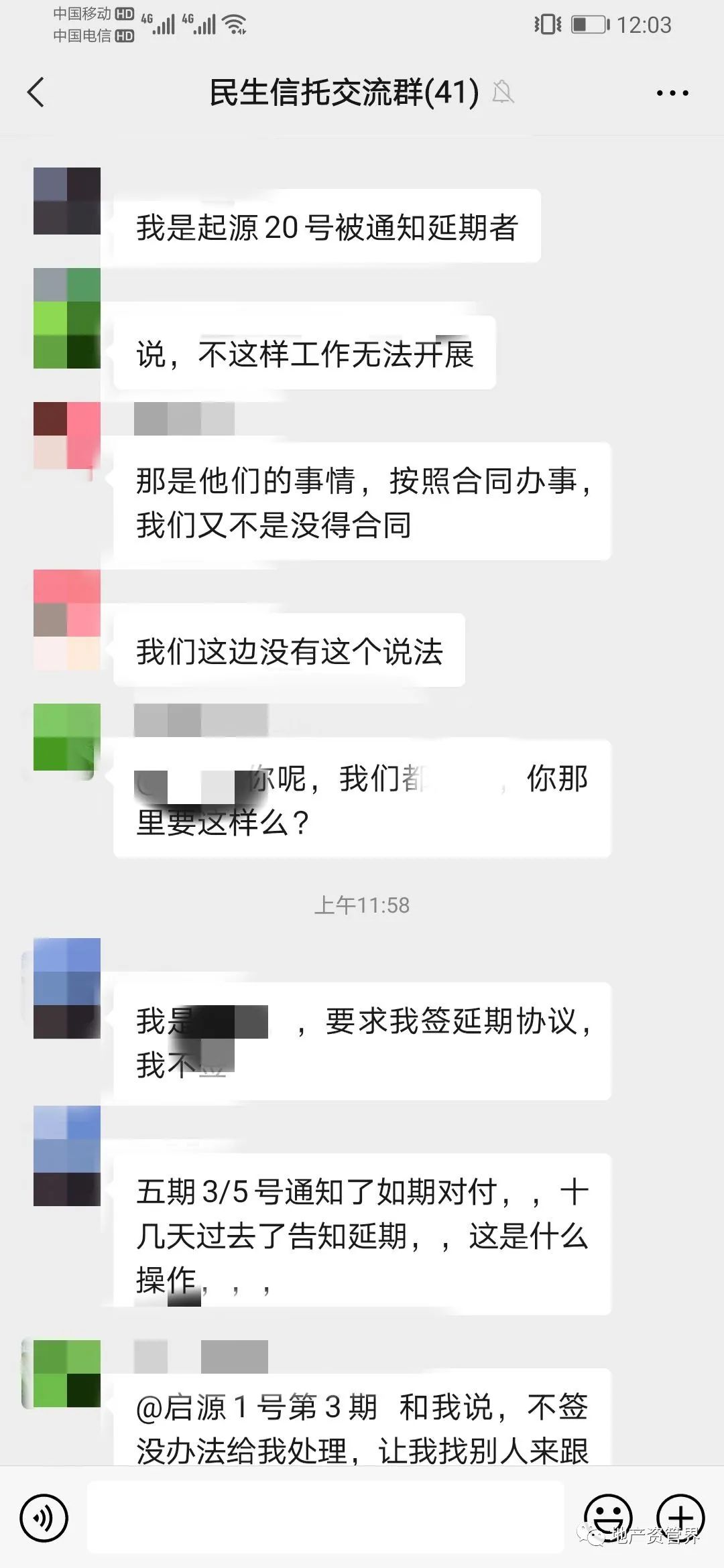據(jù)投資人透露,民生信托-啟源系列出現(xiàn)大批量違約,已經(jīng)通知投資人簽署延期協(xié)議。逾期的項目資金投向也是個謎。