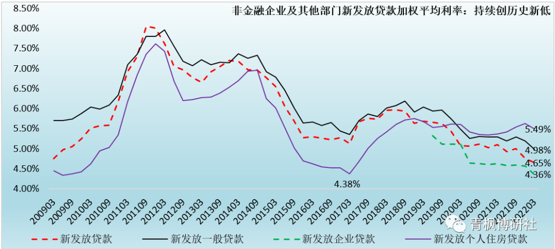 (一)央行在2021年2季度貨幣政策執行報告(參見如何理解央行2021年2季度貨幣政策執行報告?)中指出新發放貸款利率創有統計以來新低,而當時的新發放貸款利率是4.93%。不過現在看來當時的新低并不是最低,續創新低的態勢仍在持續,2021年四季度和2022年一季度新發放貸款利率分別為4.76%和4.65%,持續創有統計以來新低,且基本符合我們之前5%以下的判斷(參見LPR如期下調,未來貸款利率低于5%可能是常態)。