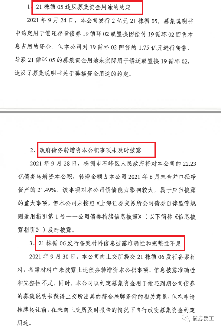 1、根據株洲循環經濟投資發展集團有限公司2021年11月26日披露的公告,公司因為“違反募集資金用途的約定”、“政府債務轉增資本公積事項未及時披露”和“發行備案材料信息披露準確性和完整性不足”等問題,被上海證券交易所出具于2021年11月22日出具監管警示函(上證債監[2021]46號)。