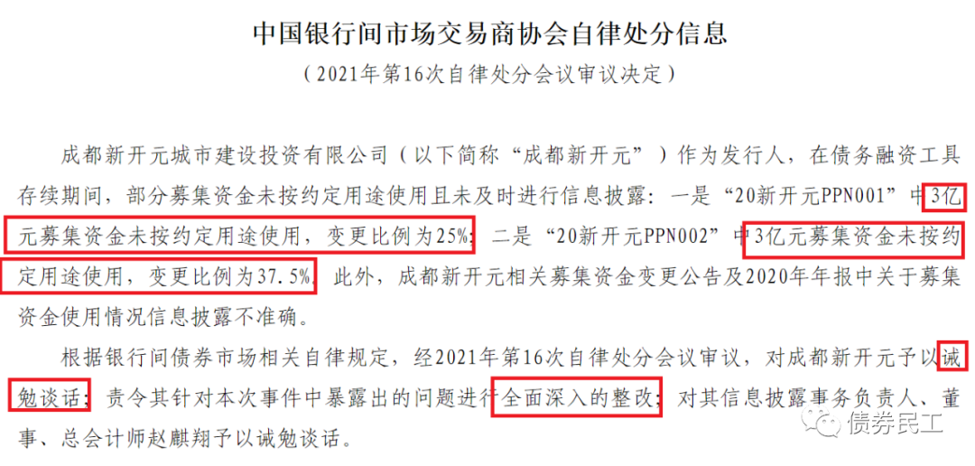 3、根據中國銀行間市市場交易商協會2021年10月14日披露的信息,成都新開元城市建設投資有限公司因在“20新開元PPN001”和“20新開元PPN002”中未按約定用途使用募集資金,被交易商協會自律處分。處分措施包括對公司的誡勉談話、全面深入的整改以及對高管的誡勉談話。