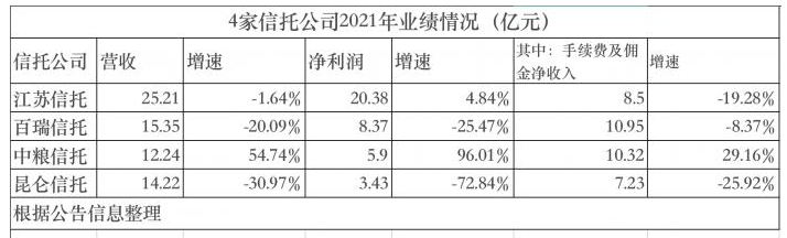 作為頭部信托公司,江蘇的數(shù)據(jù)大概是沒有什么問題的。也是這4家信托公司中綜合實(shí)力最強(qiáng)的,處于行業(yè)中上游。數(shù)據(jù)顯示,2021年江蘇凈利潤20.38億元,同比增長4.84%;2021年?duì)I收25.21億元,同比下降1.64%;手續(xù)費(fèi)及傭金凈收入為8.5億元,同比下滑19.28%,雙雙下降。