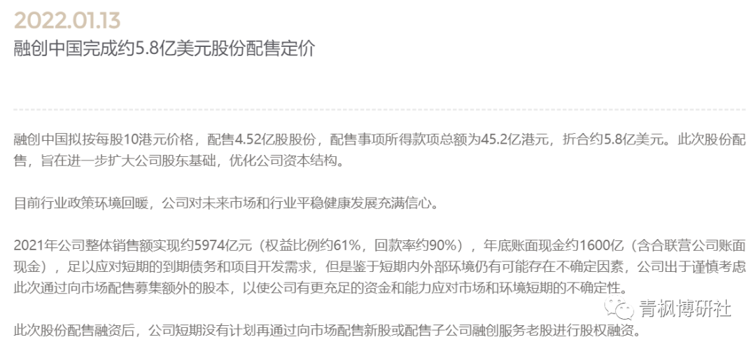 2022年1月13日,融創中國發布公告稱,其以10港元/股的對價配售4.52億股股份,配售所得款項總額為45.20億港元(折合美元約5.80億)。不過這次配股的價格相較于2021年11月13日的15.18港元/股折價幅度達34.12%,相較于2022年1月11日的收市價折價幅度則達到15%。據融創自身披露,其擬將配售所得款項的50%用于公司一般運營,另50%用于償還貸款。