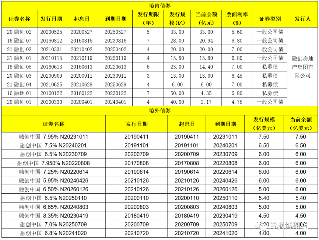 (一)目前融創合計共有9只境內存量債券,余額合計達到129.66億元人民幣。其中,2022年到期23億元,2022年需要付息約14億元人民幣。