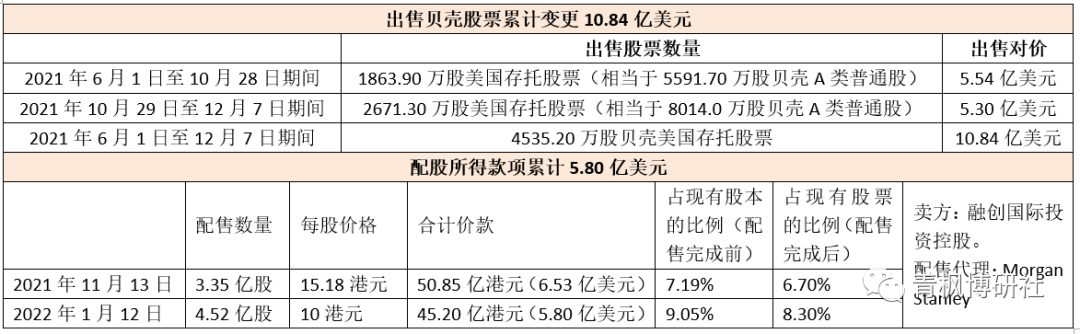 1、2021年6月1日至2021年12月7日期間,融創累計出售4535.20萬股貝殼美國存托股票,累計對價為10.84億美元。