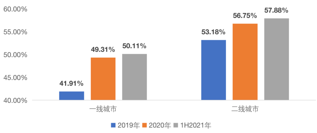 值得一提的是,一線、二線城市三房成交占比增速明顯放緩,2021年上半年,一線城市三房占比較2020年僅上漲0.8個(gè)PTS,而2020年相較2019年增長(zhǎng)了9.4個(gè)PTS,二線城市三房占比增幅為1.13個(gè)PTS,相較于此前的3.57個(gè)PTS也有明顯退坡。