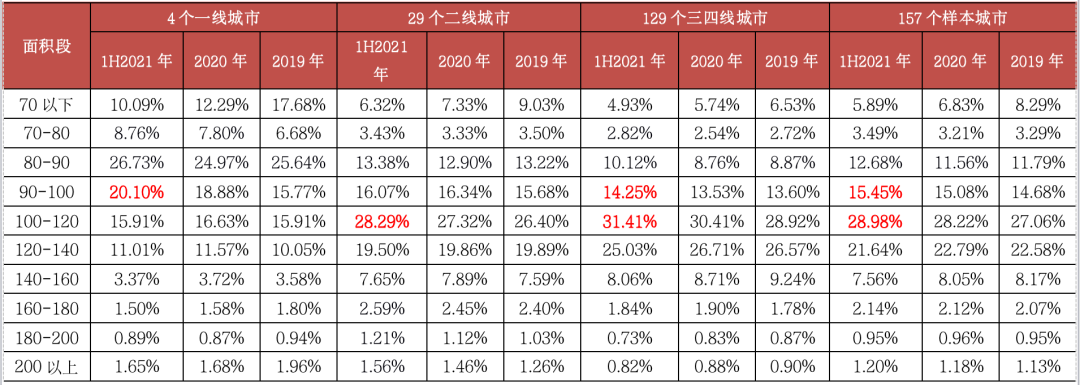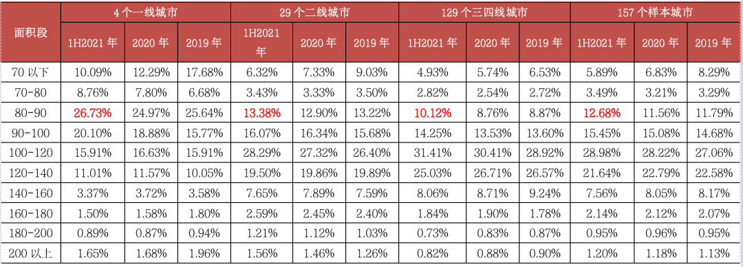 表:157個(gè)重點(diǎn)監(jiān)測(cè)城市普通住宅分面積段成交套數(shù)占比