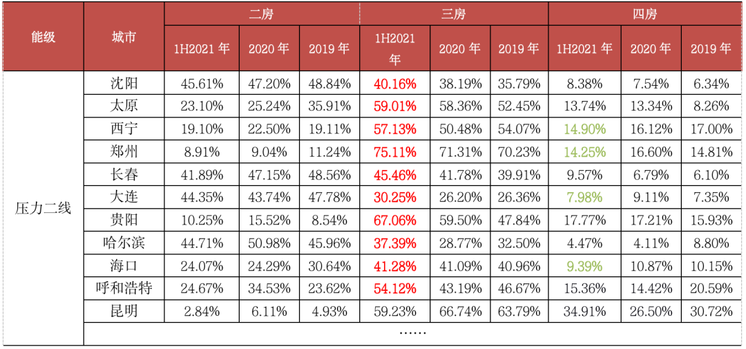表:部分二線城市普通住宅二房、三房、四房成交套數(shù)占比