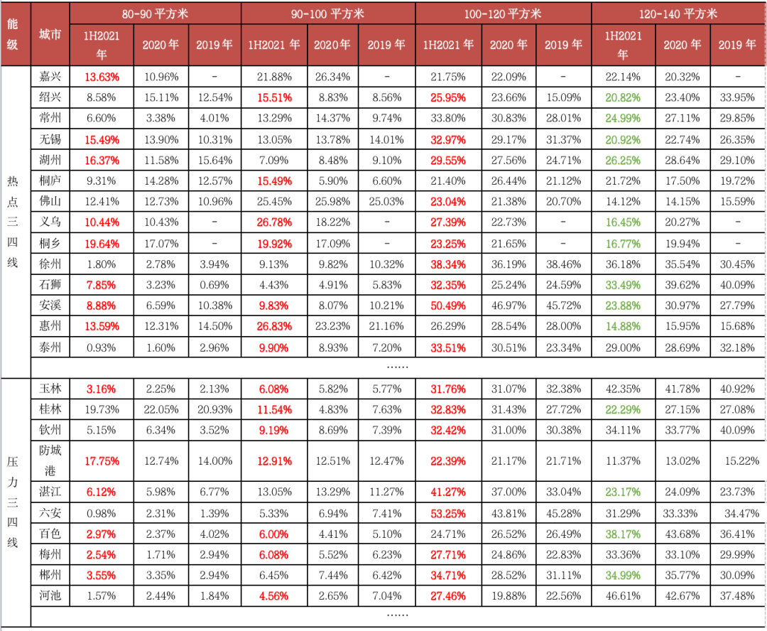 分面積段成交套數(shù)占比注:受篇幅限制略去部分三四線城市