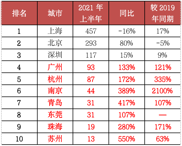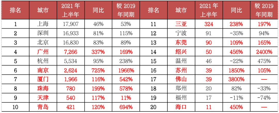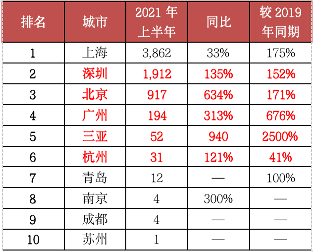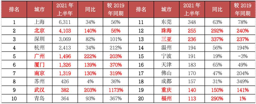 表:2021年上半年單價(jià)10萬元/平方米以上豪宅成交套數(shù)TOP20城市(單位:套)