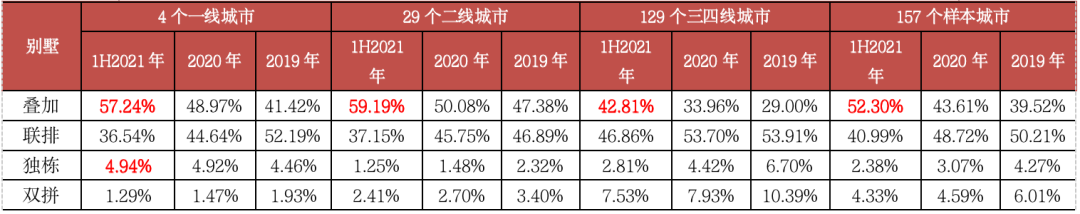 在這其中,一線城市疊加別墅最受市場(chǎng)歡迎,成交占比升至57.24%,較2020年增長(zhǎng)8.27個(gè)PTS。聯(lián)排別墅銷售遇冷,成交占比降至36.54%,較2020年銳減8.1個(gè)PTS。