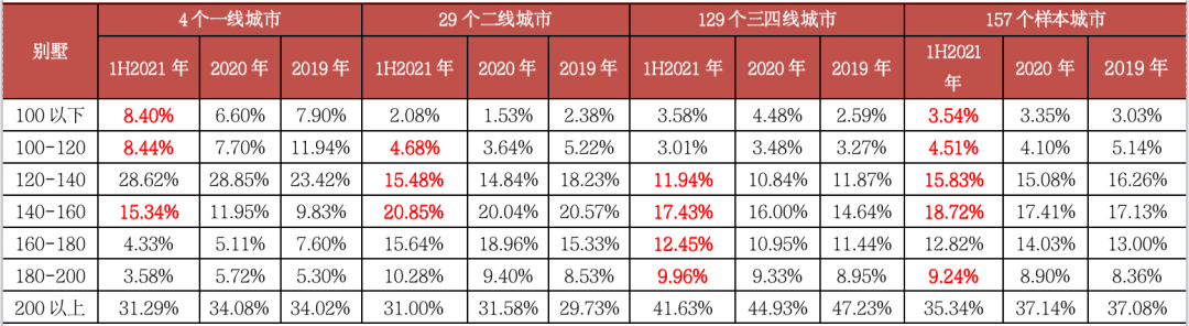表:157個(gè)重點(diǎn)監(jiān)測(cè)城市別墅分戶型成交套數(shù)占比