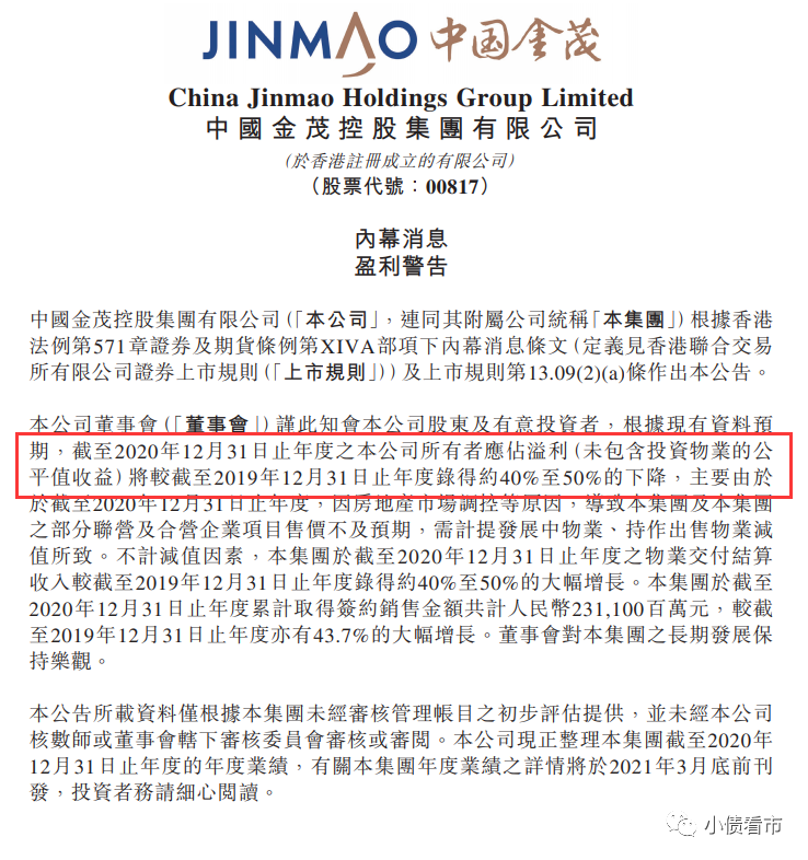 近日,中國金茂 (HK:00817)公告稱,因受房地產市場調控等因素影響,部分聯營及合營企業項目售價不及預期,截至2020年末公司所有者應占溢利同比下降約40%-50%。
