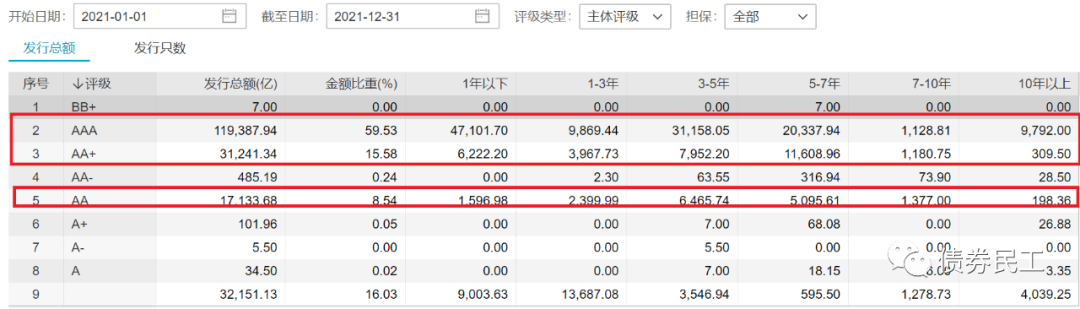 根據(jù)信用評(píng)級(jí)情況對(duì)信用債券發(fā)行數(shù)據(jù)進(jìn)行分類,可以明確看出,AAA、AA+和AA發(fā)行人的主體信用等級(jí)、發(fā)行人數(shù)量和債券發(fā)行數(shù)量呈現(xiàn)了明顯的負(fù)相關(guān)關(guān)系,主體信用等級(jí)越高,發(fā)行人的數(shù)量越少,但是債券發(fā)行金額越高。以2021年為例,AA發(fā)行人的發(fā)行金額在2021年占比只有8.54%,而AAA發(fā)行人的發(fā)行金額在2021年占比則高達(dá)59.53%。