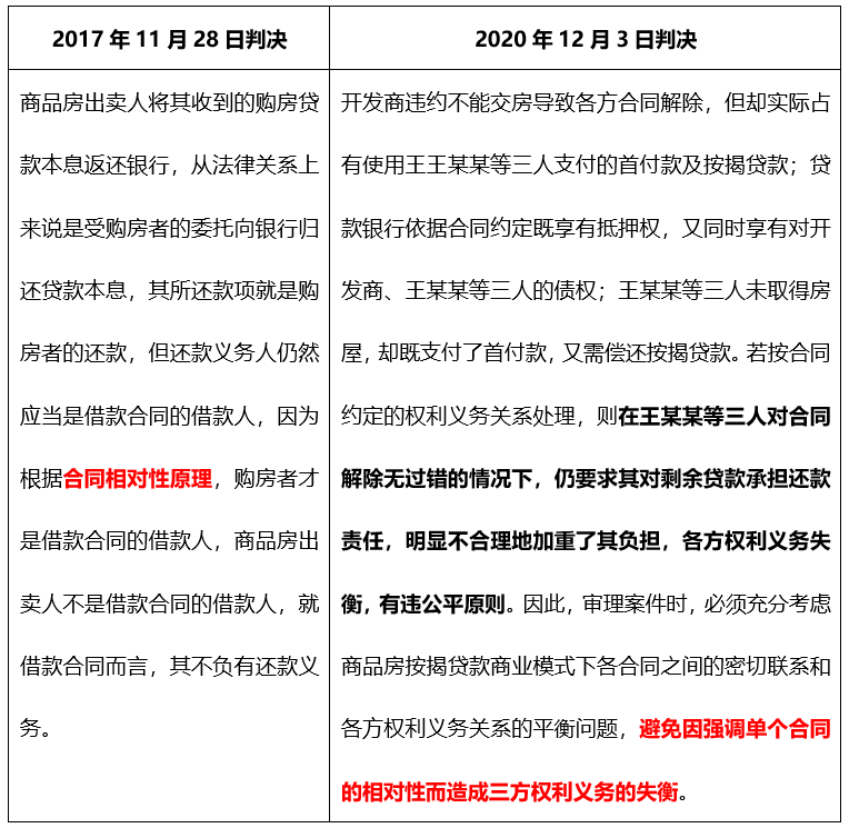2020年12月3日, 最高院在作出的王忠誠、王琪博金融借款合同糾紛再審民事判決書中認為, 因開發商原因未按照約定期限交付房屋,致使案涉《商品房預售合同》解除,《借款合同》《抵押合同》因合同目的無法實現亦被解除。根據商品房買賣合同司法解釋的規定,應由出賣人即開發商將收取的購房貸款本金及利息返還貸款,購房者不負有返還義務。