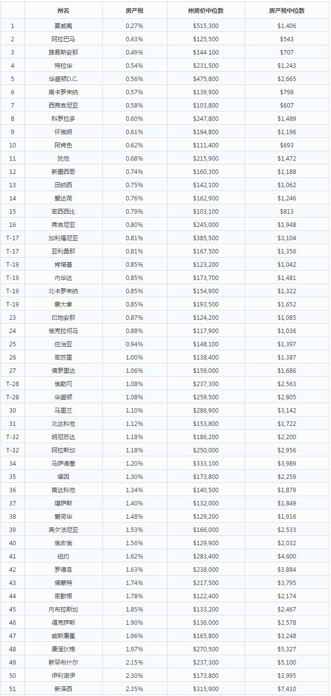 各州稅率不同,集中在0.27%~2.35%之間。事實上,美國房產(chǎn)稅雖然不低,但絕沒有大家想象的高。2017年美國政府全美普查數(shù)據(jù)顯示,當(dāng)年美國家庭房產(chǎn)稅支出中位數(shù)為2149美元,而當(dāng)年美國家庭收入中位數(shù)61372美元。房產(chǎn)稅只占家庭收入的3.5%。