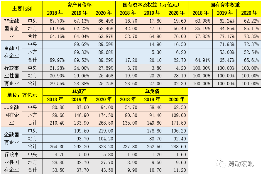 (一)民企和中小企業(yè)是中國經濟的活力源泉,而央企則是中國經濟的領頭羊。根據2021年11月公布的《關于2020年度國有資產管理情況的綜合報告》(自2018年以來每年的10月下旬公布當年國有資產管理情況報告)。截至2020年底,非金融國有企業(yè)的總資產和總負債分別為268.50萬億元和171.50萬億元。其中,央企和地方國企的總資產分別為94.00萬億元和174.50萬億元,總負債分別為62.50萬億元和109.00萬億元,資產負債率分別為66.49%和62.46%、國有資本權重分別為62.22%和86.11%。