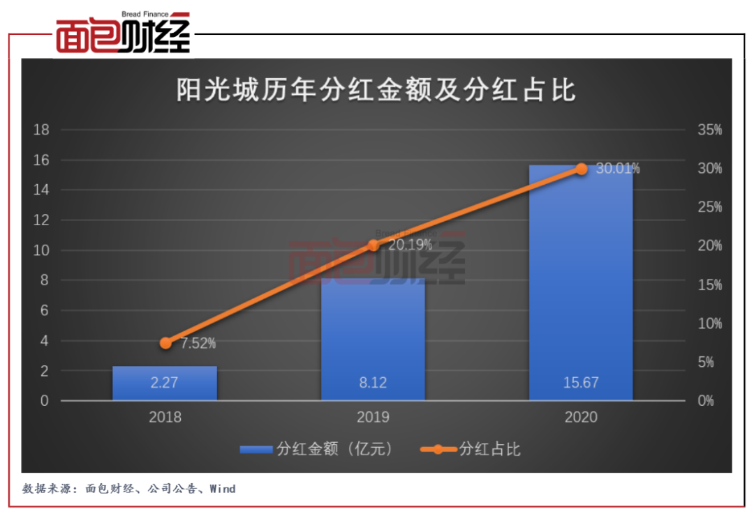 基于較為穩健的財務表現,陽光城近年來持續加大分紅力度。財報顯示,公司2020年擬向全體股東每10股派發現金股利3.81元(含稅),合計分紅金額達到約15.67億元,占同期歸母凈利潤的30.01%,相比過去幾年明顯提升。