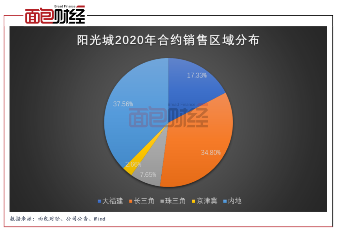 從銷售區域分布來看,陽光城在穩步推進全國化布局的同時,持續把大福建和長三角作為重倉之地。數據顯示,公司2020年來自于大福建和長三角區域的銷售金額占總銷售金額的比例約為五成,其他銷售來自于珠三角、京津冀以及內地地區。