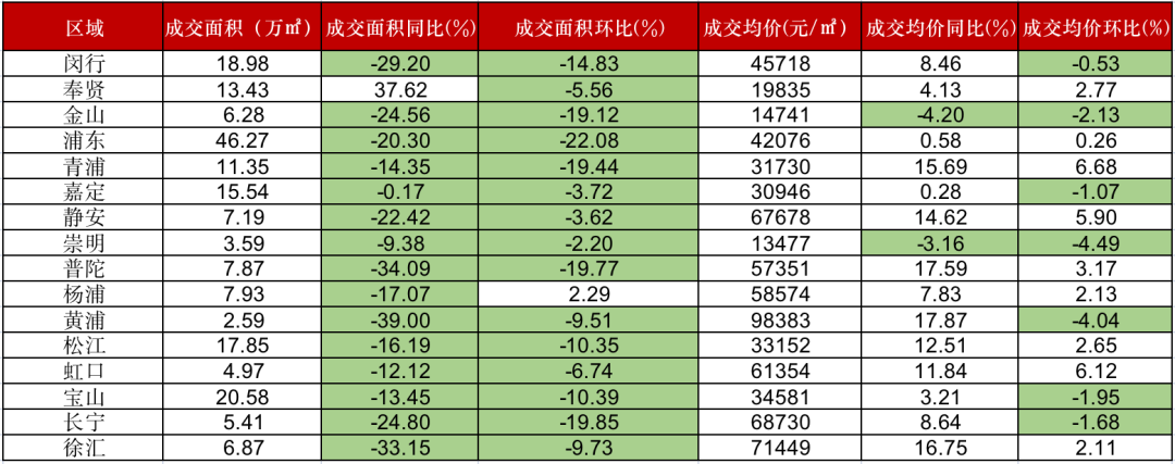 具體到區域來看,閔行、金山、浦東、靜安、普陀、長寧同環比跌幅較大,而奉賢為上海唯一成交面積同比增長的區域。成交均價方面,金山、崇明出現同、環比下跌,閔行、嘉定、黃浦、寶山、長寧同比上漲,環比下跌。