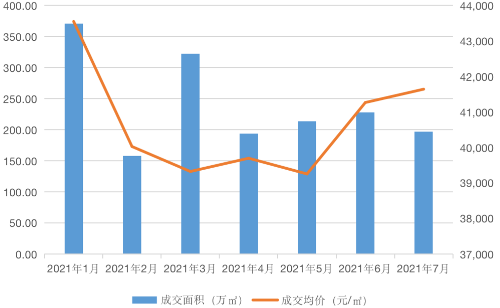 從成交數據來看,2021年7月,上海全市商品房成交面積196.7萬平方米,同比下降17.68.環比下降13.7%,成交均價41644元/平方米,同比上漲3.72%,環比微增0.91%。