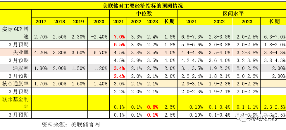 (1)上調了美國未來三年的經濟增長預期,預計2021-2023年的實際經濟增速(中位數)分別為7%、3.3%和2.40%,相較于今年3月(中位數)預期的6.50%、3.30%和2.20%有一定上升。同時預計長期經濟增速為1.80%(中位數)。