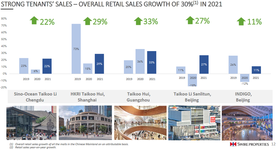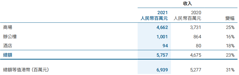 2021年集團中國內地投資物業(yè)組合的租金收入總額增加24%至港幣35.61億元,主要反映零售銷售額上升及人民幣升值。