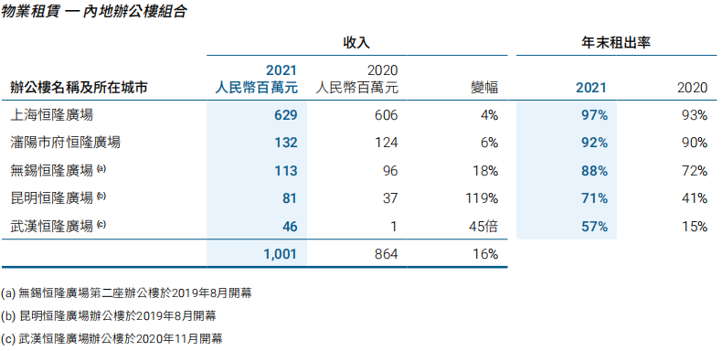 辦公樓組合方面,占內地物業(yè)租賃收入總額的17%。2019和2020年開業(yè)的三座新辦公樓租出率持續(xù)上升,令辦公樓的總收入錄得16%的升幅。