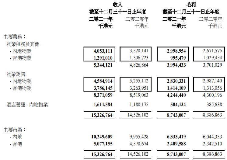 集團內地已落成綜合用途投資物業(yè)資產組合包括辦公室、零售、出租公寓和酒店,產生收入同比增長21%至56.6 億港元,毛利同比增長14%至35億港元。