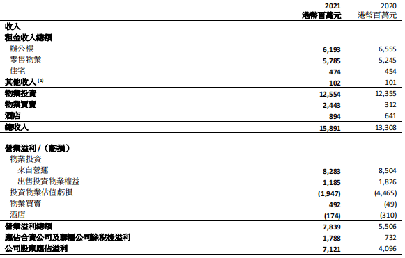 2021年全年,恒隆地產有限公司及其附屬公司的總收入和營業(yè)溢利分別上升15%至港幣103.21億元和上升14%至港幣73.71億元。年內并無物業(yè)銷售收入入賬。