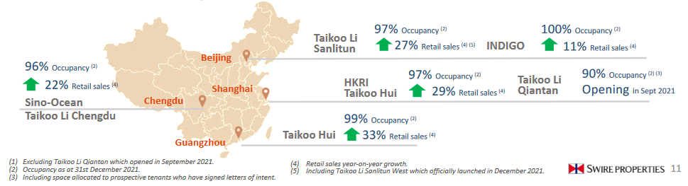零售物業(yè)方面,來自中國內地零售物業(yè)的應占租金收入總額增長29%至港幣43.99億元。撇除租金支援攤銷和人民幣升值的影響,集團應占租金收入總額上升17%。2021年12月31日,集團中國內地已落成零售物業(yè)的估值為港幣693.74億元。
