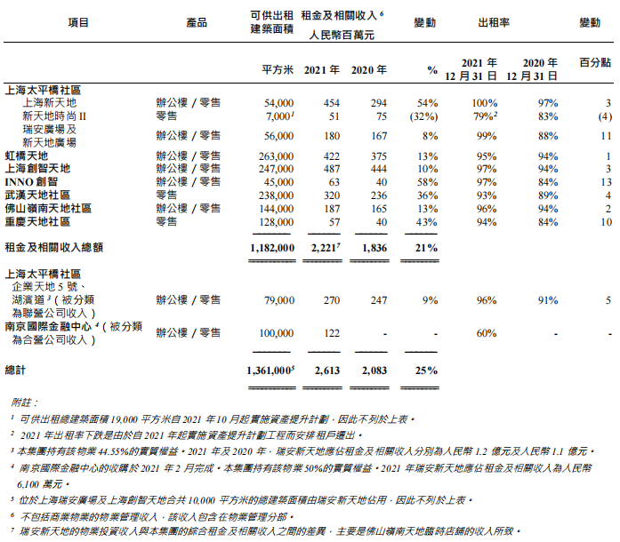 零售及辦公投資物業(yè)分別占物業(yè)投資租金收入的61%及39%(包括企業(yè)天地5號和湖濱道,以及南京國際金融中心)。截至2021年12月31日,出租率平均達93%。