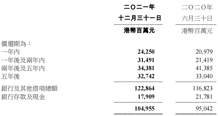 債務方面,截至2021年12月31日的負債比率為17.5%。截至2021年12月31日,債項總額為港幣1228.64億元。扣除銀行存款及現金港幣179.09億元的凈債項為港幣1049.55億元。