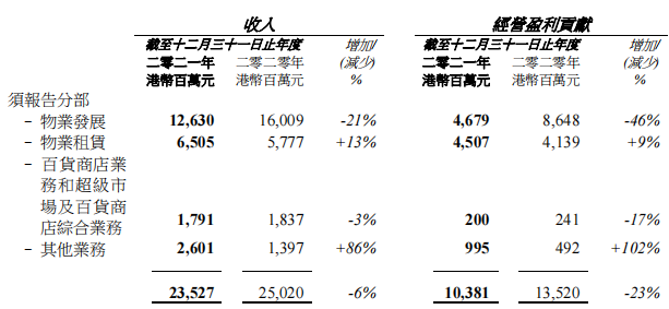 銷售物業(yè)收入為126.30億港元,租金收入為65.05億港元,百貨商店業(yè)務和超級市場及百貨商店綜合業(yè)務收入為17.91億港元,其他業(yè)務收入為26.01億港元。