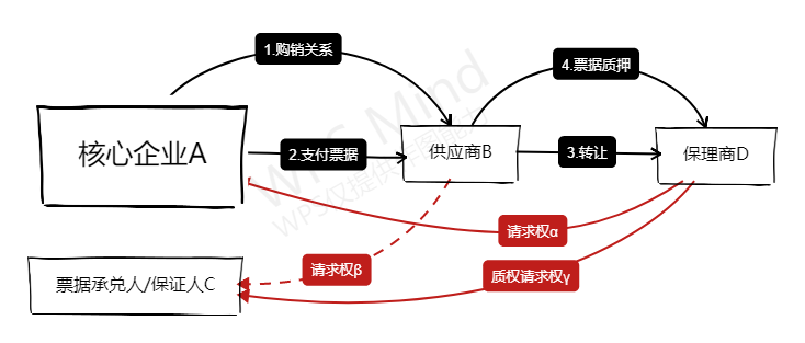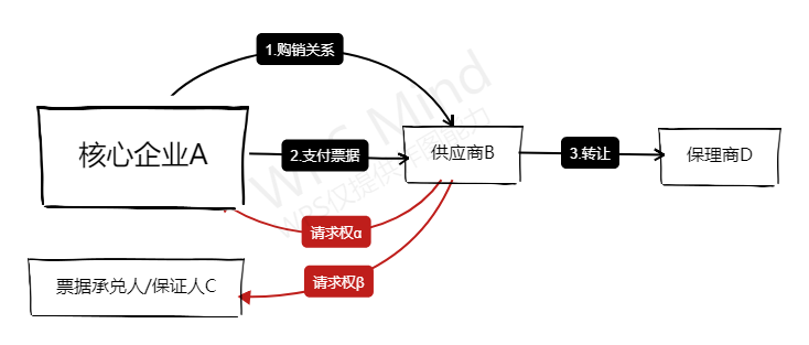 “先票后保”描述一類供應鏈金融當中的保理融資模式,舉例來講:鋼鐵產業的供應鏈交易中,核心企業A以賒賬的方式向其上游供應商B購買一批鋼材(“購銷關系”),付款賬期三個月,此時B對A形成應收賬款α,也即從法律層面描述B對A擁有債權請求權α。與此同時,A向B簽發或者背書轉讓一張承兌人為A或者C(或者票據保證人為C)的商業匯票,金額與應收賬款α一致,六個月后到期,也即從法律層面描述B擁有票據請求權β。此時B出于兌現需求,找到保理商D,將其因購銷關系而產生的應收賬款α(也即債權α)轉讓給保理商D,獲得保理融資款項。