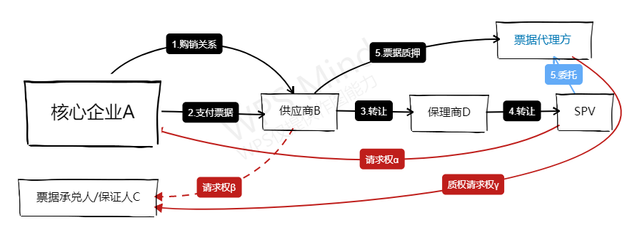 如前所述,“先票后保”模式下,第一權利順位是票據權利——票據請求權β,這幾乎意味著底層資產的第一還款來源是票據債務人對于票據的給付義務,如果將票據背書轉讓給保理商D或者SPV,讓后者直接擁有票據持有人權利,很難說清保理商D或者SPV受讓的底層資產是否屬于“源自票據的請求權”[3]或者直接被認為屬于票據貼現,而這對于保理商或者資產證券化項目來講,均有著合規問題上無法跨越的障礙。因此保理商D在開展保理業務時,受讓的直接標的并非票據權利(票據請求權β),而是處于中斷或休眠狀態的應收賬款債權α(債權請求權α),但票據項下的回款又理所應當成為應收債權項下回款,使得保理業務從法律邏輯上可以形成閉環。