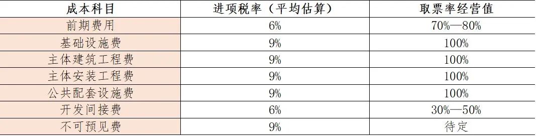 根據當前政策,銷項稅率按照9%計算,土地成本虛擬進項稅率也為9%計算,成本及費用的進項稅率有6%、9%及13%等,但需注意各項成本的取票率,根據各項成本費用占比計算綜合取票率數值。