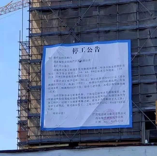 但是好兆頭并沒有能夠溢到城市的項目上。同一天,長沙恒大珺悅府工程部、恒大廣西公司、恒大山西公司相繼發布通知稱,因所在公司拖欠員工公積金及工資,現全體罷工,罷工期間所有業務停辦,具體復工時間待定。