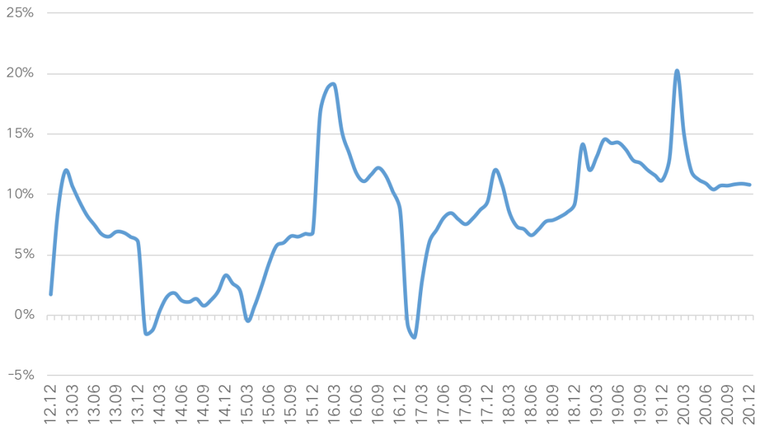 從近十年全國百城房價(jià)漲幅情況來看,2012年房價(jià)漲幅最低,至2018年漲幅均在10%以下,2019年百城房價(jià)漲幅達(dá)到了11.2%至近十年來制高點(diǎn),2020年百城房價(jià)漲幅有所回落,但仍然高位運(yùn)行。