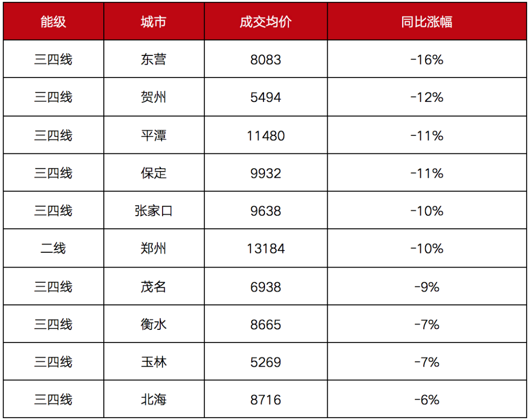 表:2020年100城新建商品住宅成交均價(jià)跌幅TOP10(單位:元/平方米)