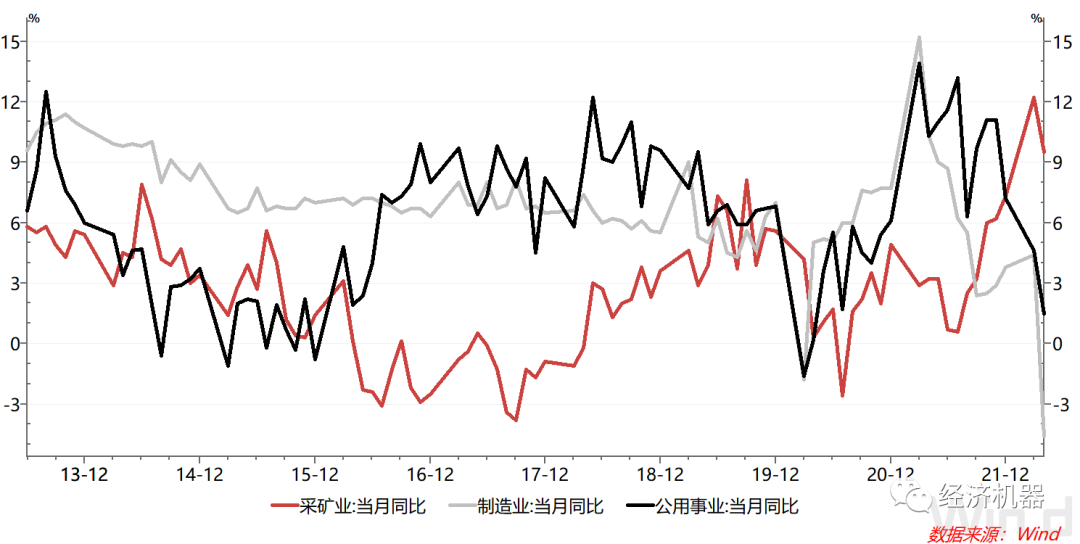 制造業工業增加值同比下滑4.6%,增速較上月回落9個百分點,也是近年來首次轉負。制造業對供應鏈要求較高,疫情升級下,供應鏈中斷對制造業沖擊尤為明顯。