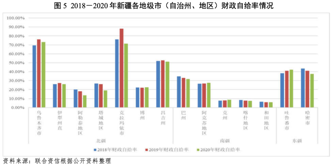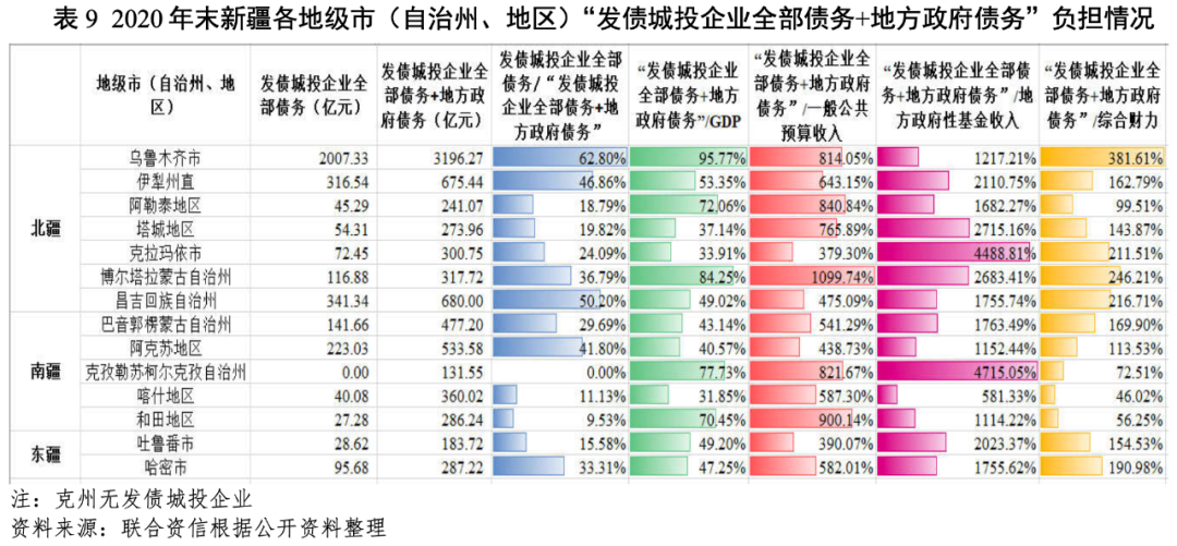 從各地區債務負擔看,“發債城投企業全部債務+地方政府債務”/GDP的比值相對較高的地級市(自治州、地區)分別為烏魯木齊市、伊犁州直、阿勒泰地區、博州、克州以及和田地區,均超過50%,債務負擔重。