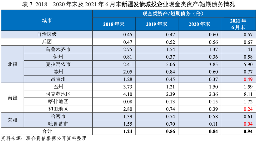 截至2021年6月末,自治區級、喀什地區和烏魯木齊市發債城投企業資產負債率均在70%以上,省級、兵團、烏魯木齊市和昌吉州發債城投企業全部債務資本化比率均在50%以上,債務負擔相對較重。