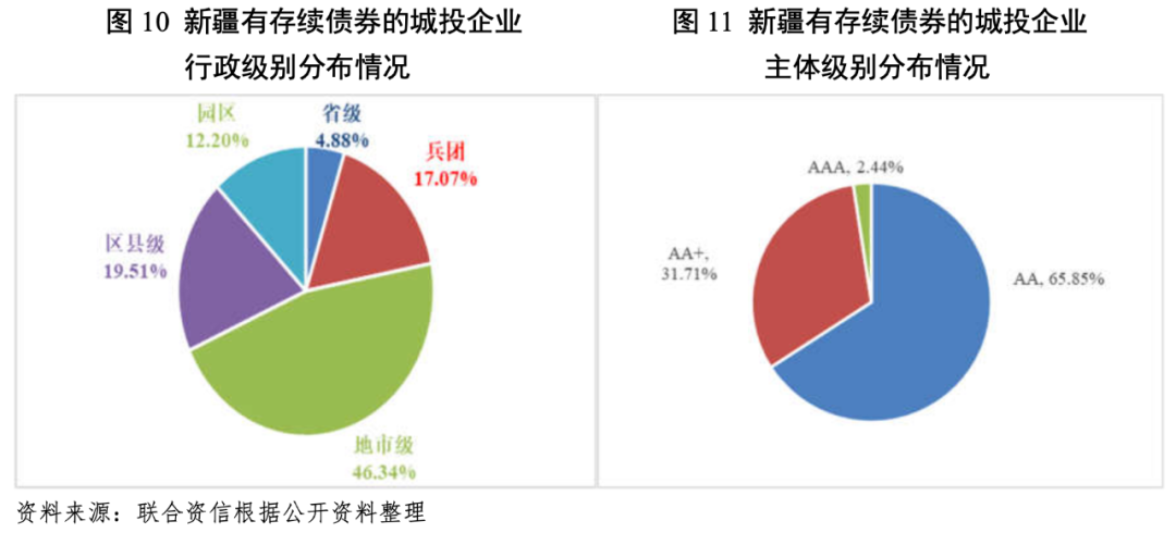 從主體信用級別區域分布看,新疆發債城投企業中AAA級主體1家,為烏魯木齊城市建設投資(集團)有限公司;AA+級城投企業13家,其中自治區級城投企業2家、兵團級城投企業2家,烏魯木齊市本級和園區城投企業各2家,其余分布在伊犁州、昌吉州、巴州和阿克蘇地區;AA級城投企業27家,其中兵團級城投企業5家,伊犁州和烏魯木齊市城投企業分別為6家和4家,其余分布在昌吉州、阿克蘇地區、哈密市、巴州、博州、和田地區、喀什地區和吐魯番市。